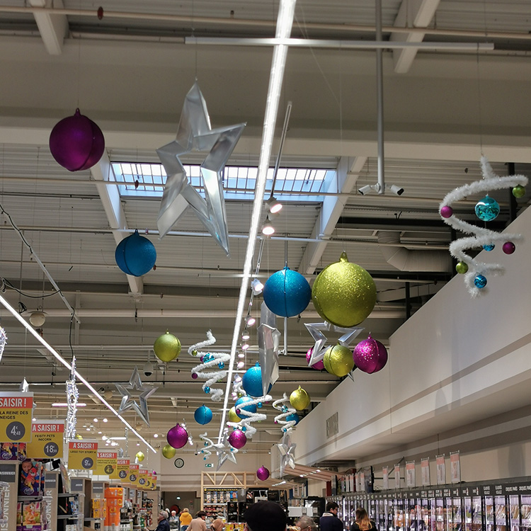 Décoration de Noël E. Leclerc – Vitré 2018 / 2019 Pour Noël 2018 et 2019, nous avons décoré le plafond du Centre E.Leclerc de Vitré avec des étoiles LED blanc froid, des étoiles argent thermoformées et des boules aux couleurs originales : violet, vert et turquoise. Ces décorations suspendues apportaient une ambiance festive et moderne,… Poursuivre la lecture Décoration Noël – E.Leclerc – Vitré – 2018 et 2019
