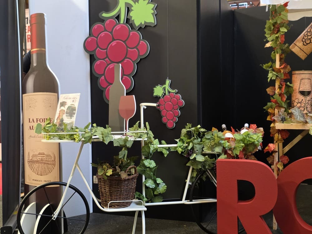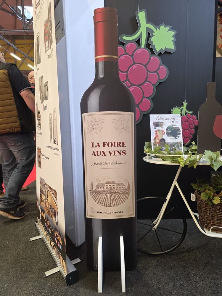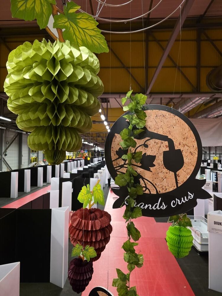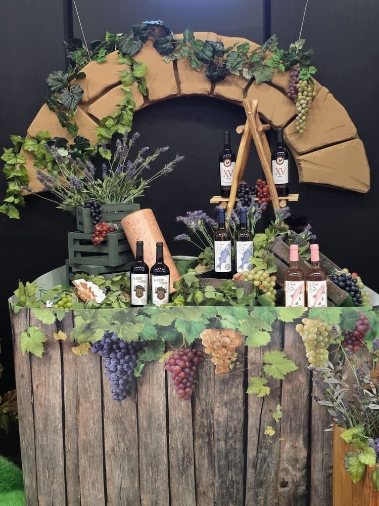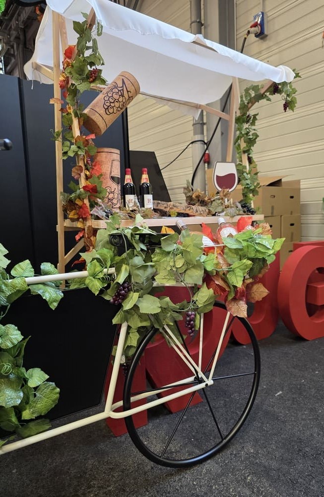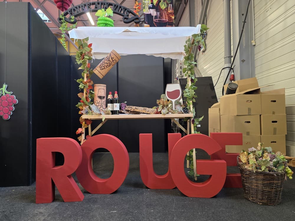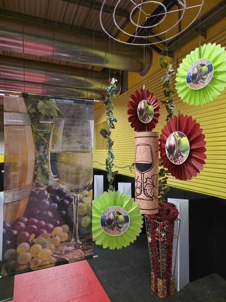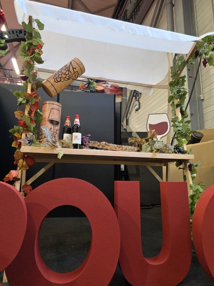 Nous avons également conçu des arches en polystyrène imitation pierre, de grandes bouteilles de vin 2D (1m60), des silhouettes de bouteilles en verre et de grappes de raisin en mousse expansée, ainsi qu’une bouteille géante gonflable, véritable élément phare de cette mise en scène.