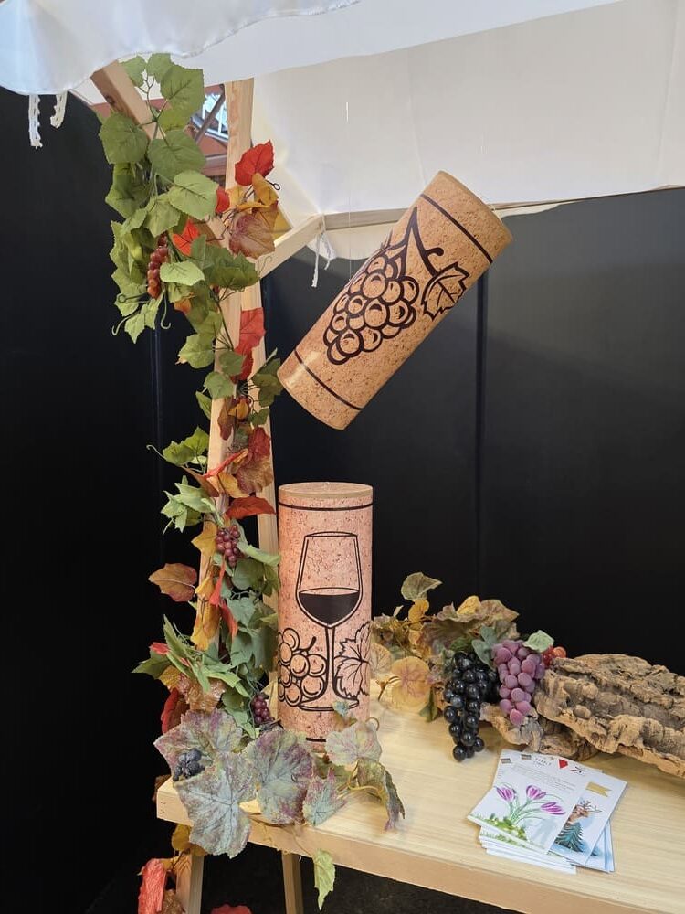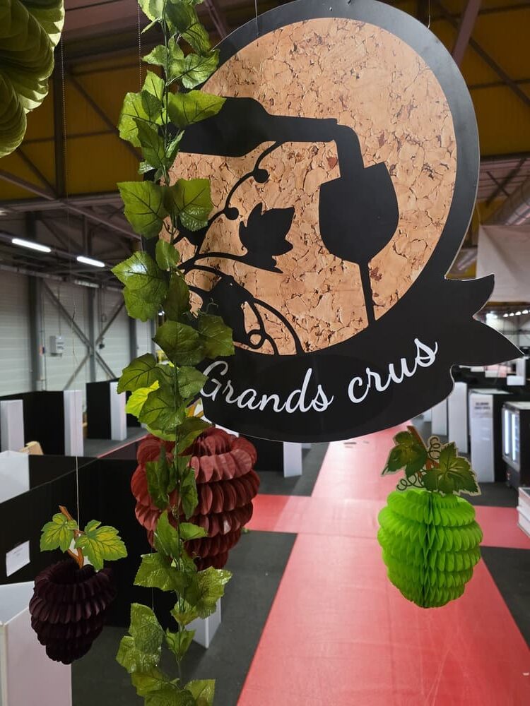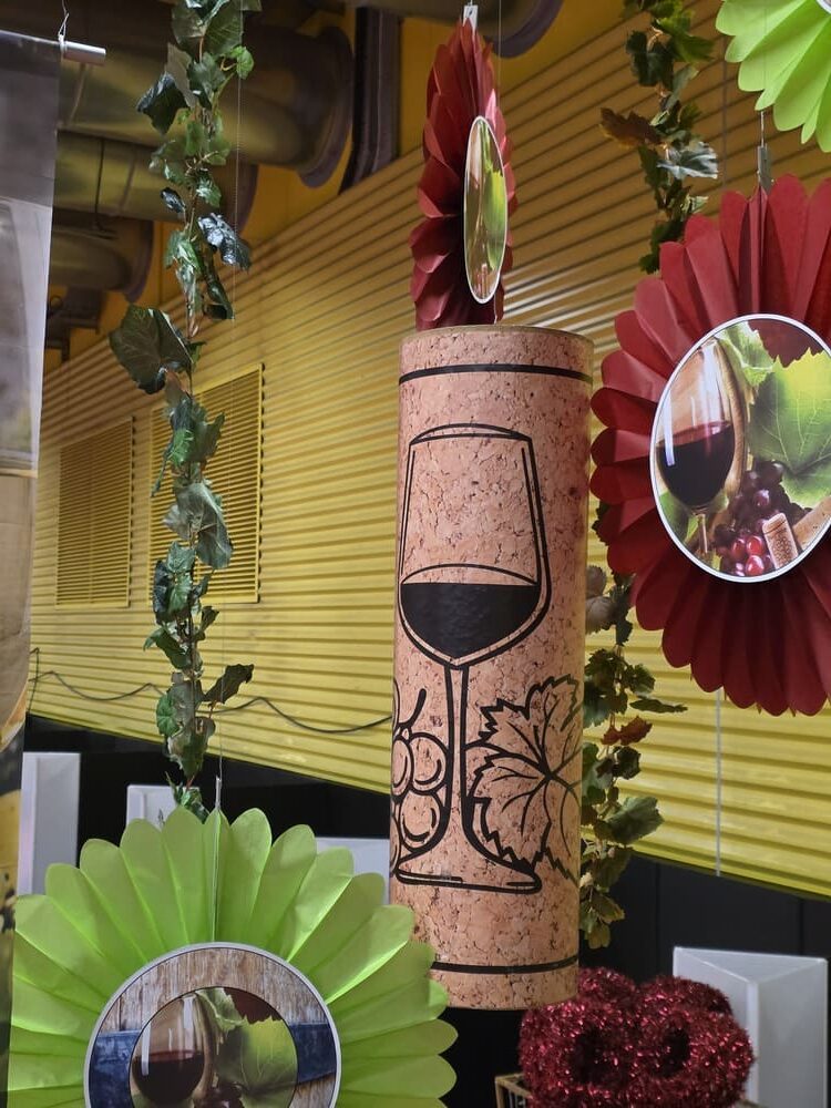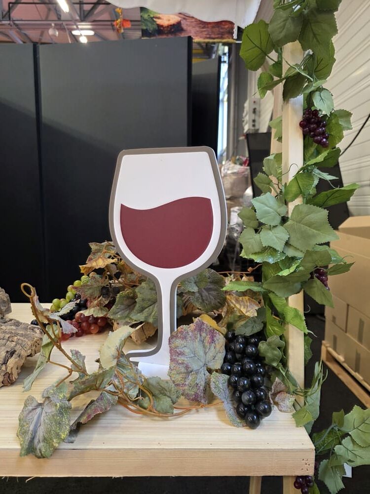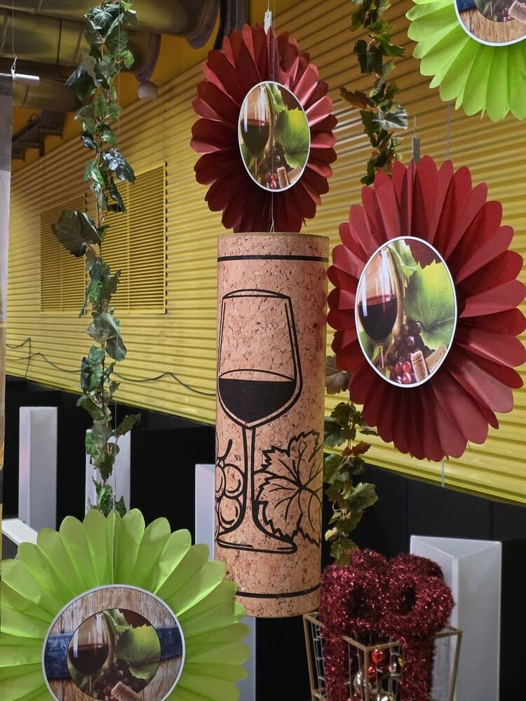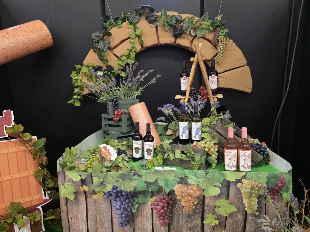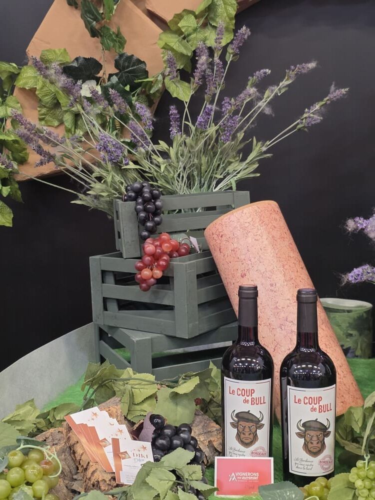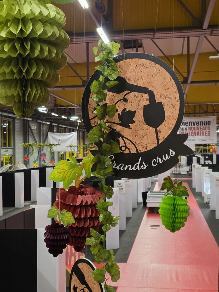 Nous avons également conçu des arches en polystyrène imitation pierre, de grandes bouteilles de vin 2D (1m60), des silhouettes de bouteilles en verre et de grappes de raisin en mousse expansée, ainsi qu’une bouteille géante gonflable, véritable élément phare de cette mise en scène.