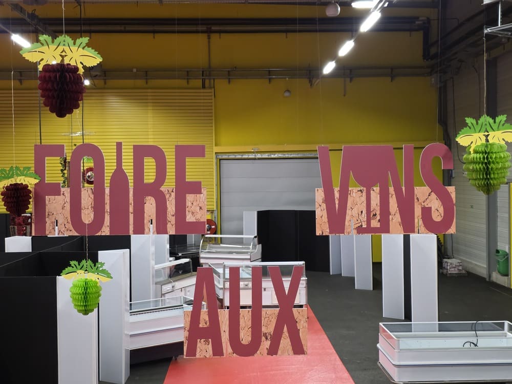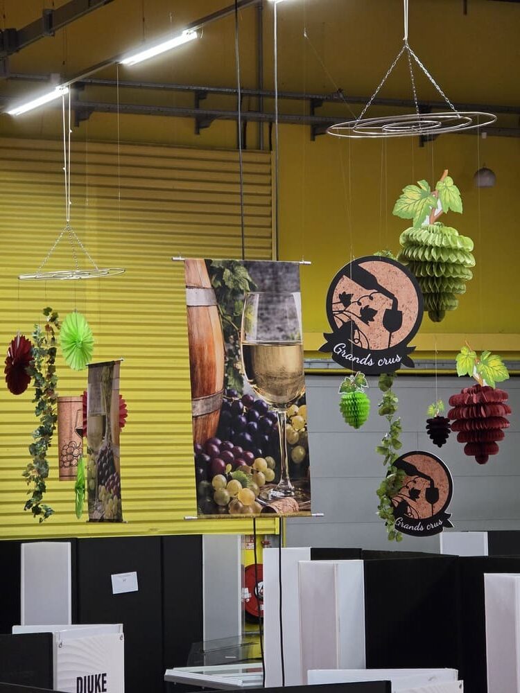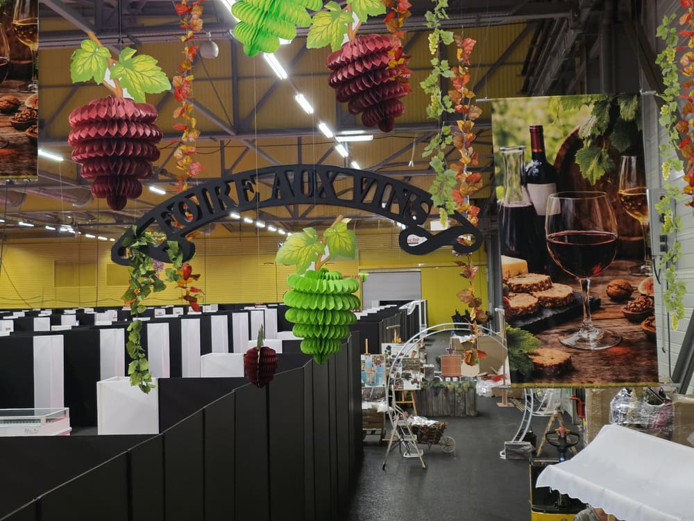 Nous avons mis en place une scénographie complète sur le thème de la Foire aux vins, avec une large variété d’éléments décoratifs :