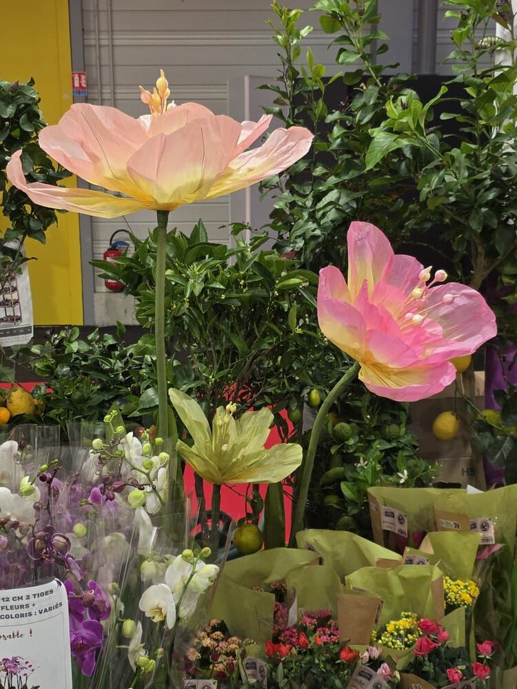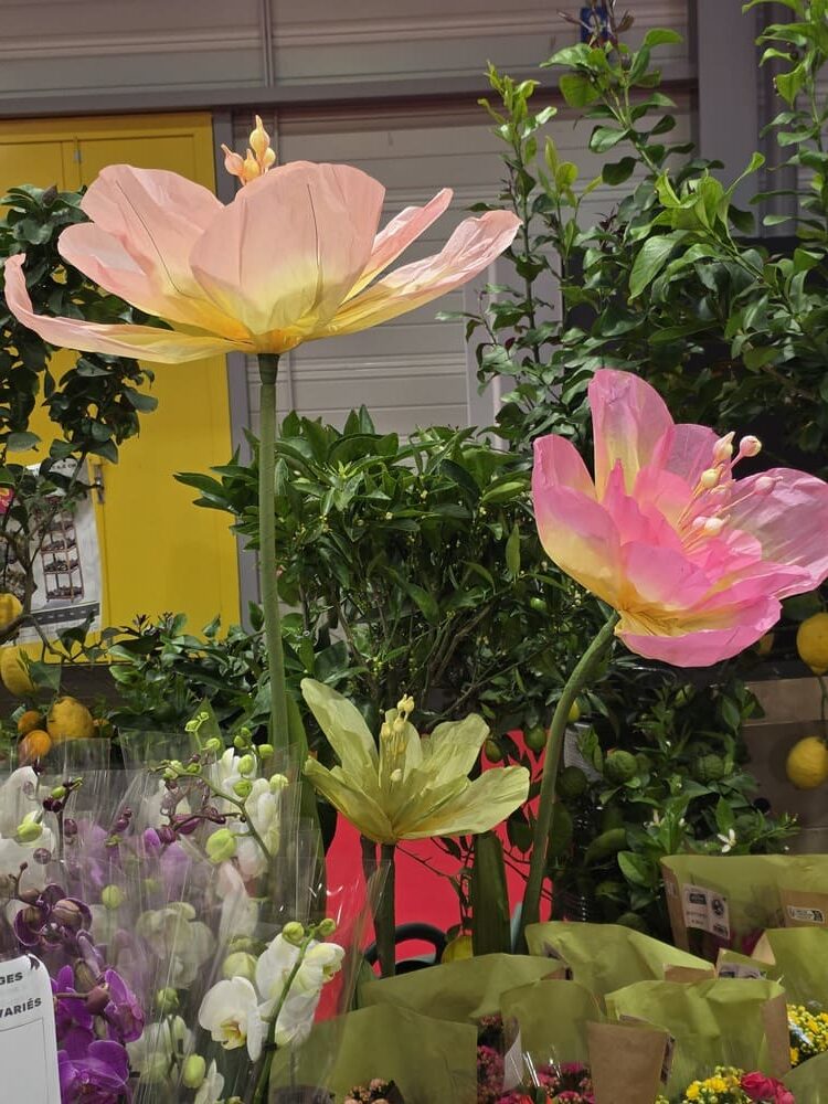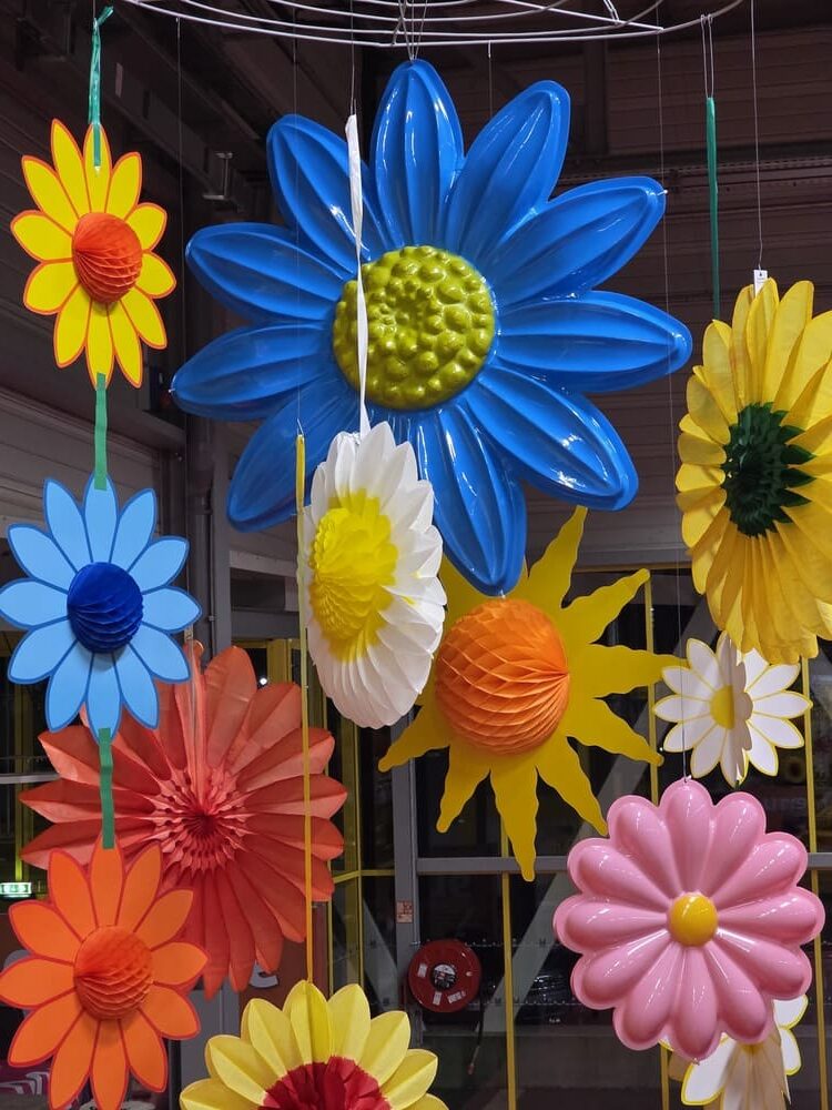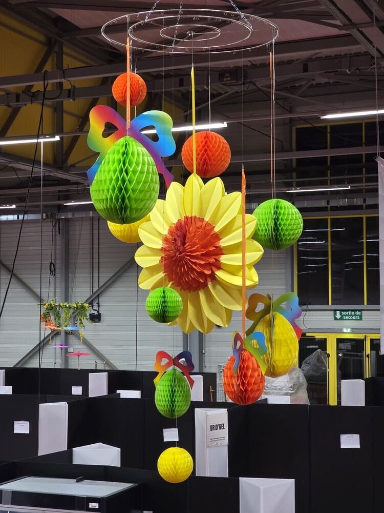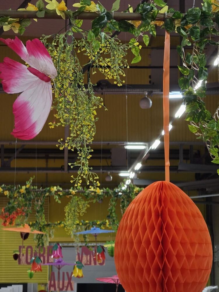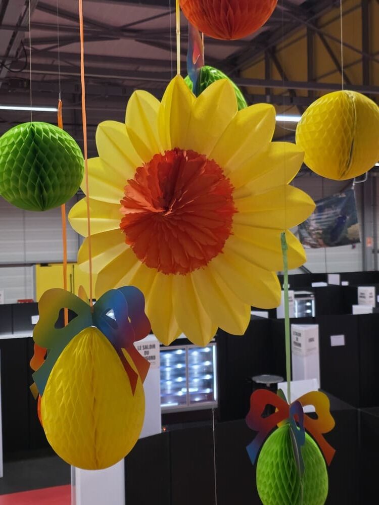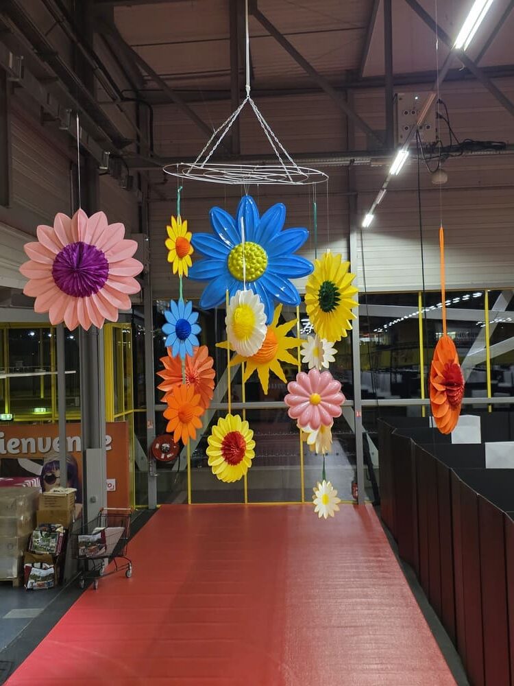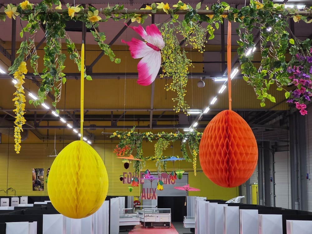 Pour célébrer le printemps, notre équipe a déployé une décoration festive et colorée composée de fleurs géantes, têtes de fleurs en papier alvéolé et en PVC thermoformé, œufs de Pâques à suspendre, guirlandes de fleurs, papillons décoratifs, ainsi que des rondelles d’agrumes et fruits en papier alvéolé.