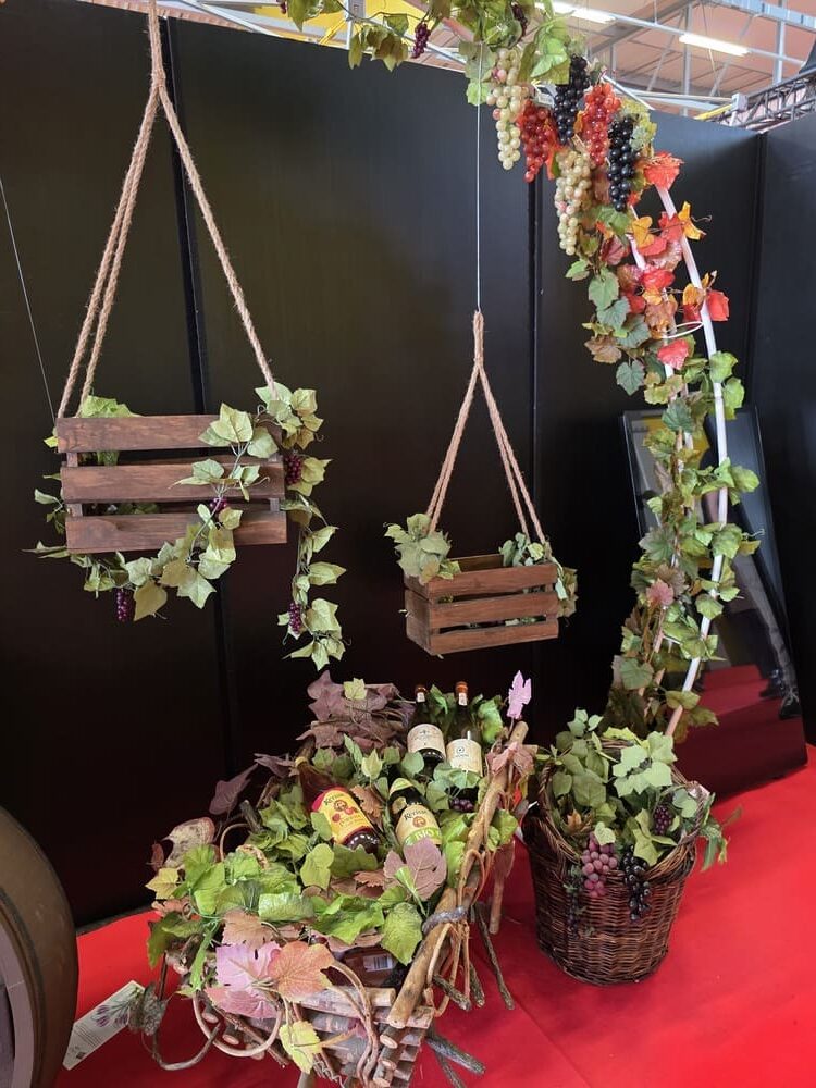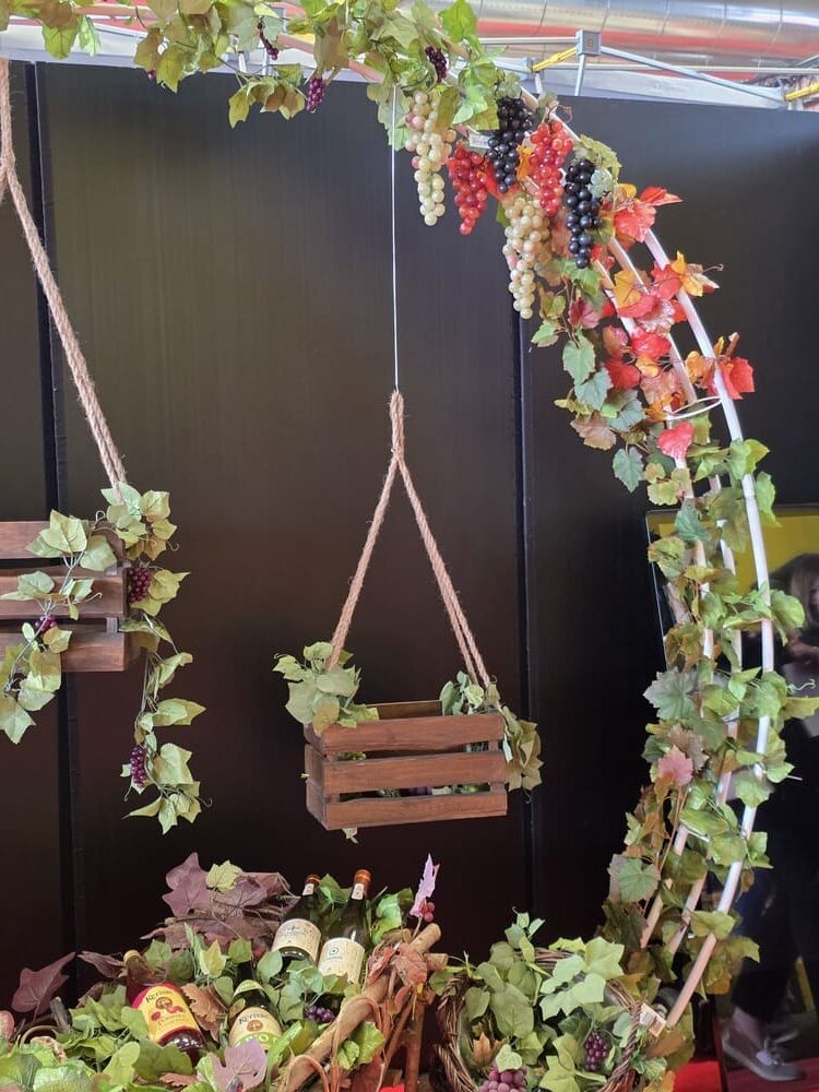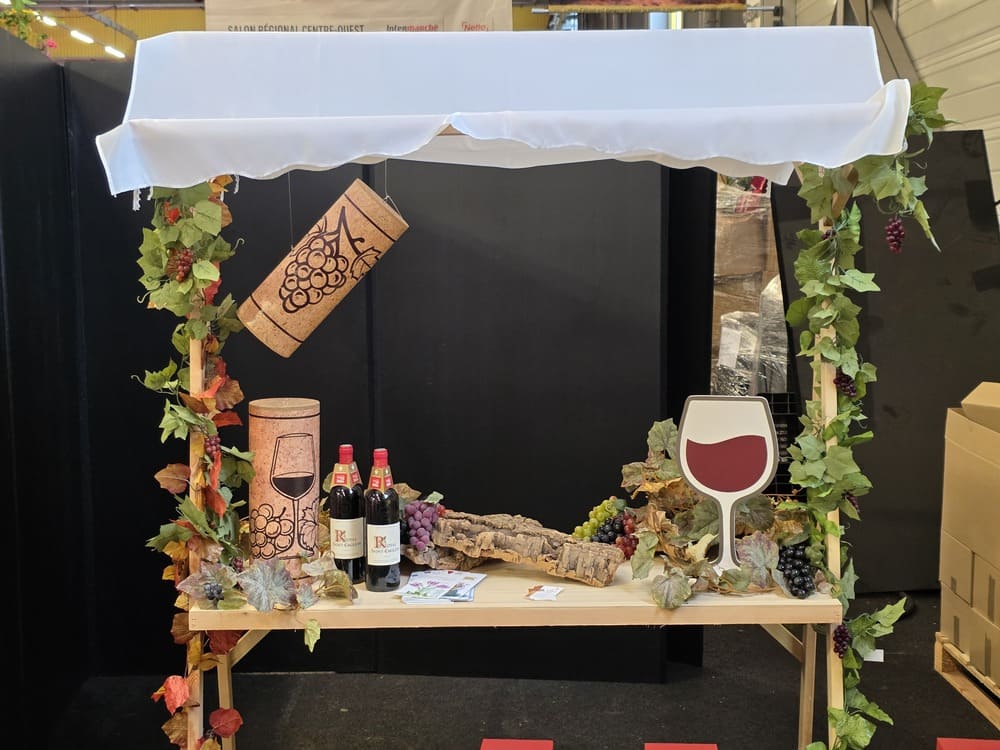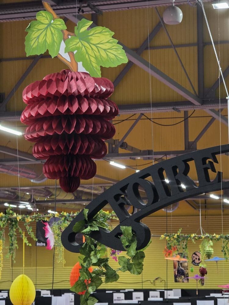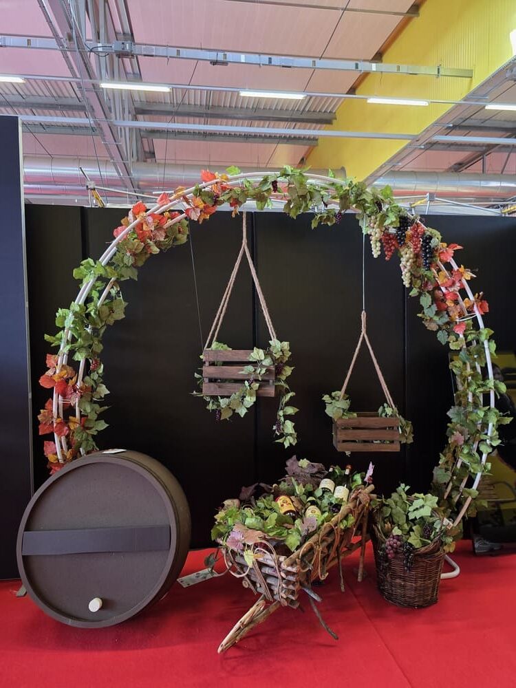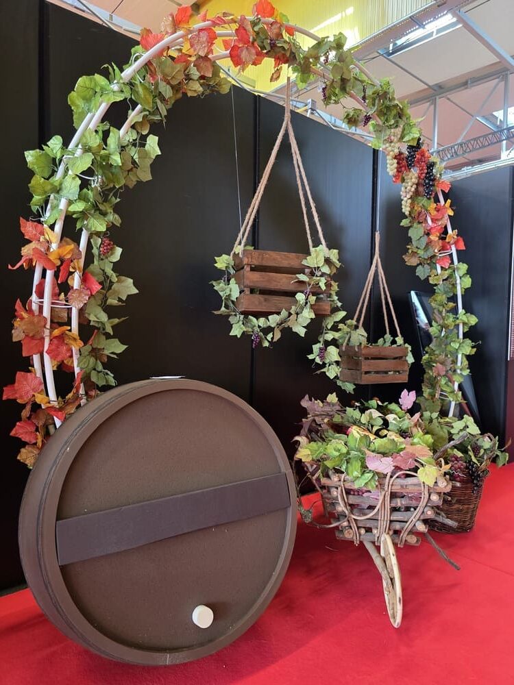 arches décoratives, grappes de raisin en plastique et en papier alvéolé, guirlandes de vignes, kakemono tissu, bouchons géants personnalisables, lettres géantes en polystyrène, structures en métal et en bois (comme un étal de marché ou un vélo de décoration).