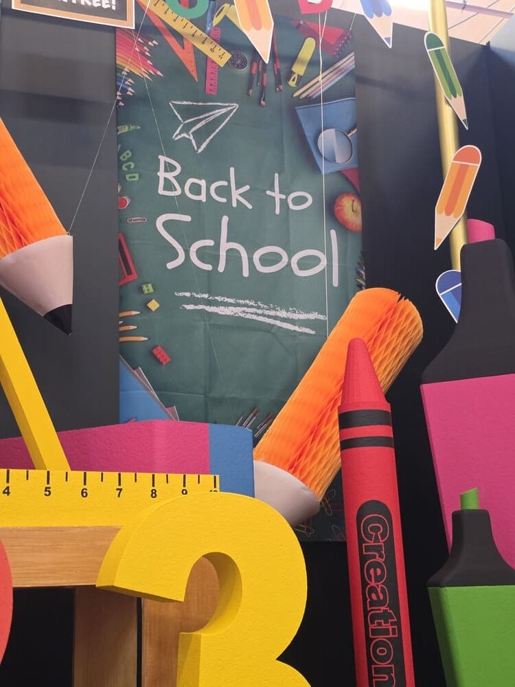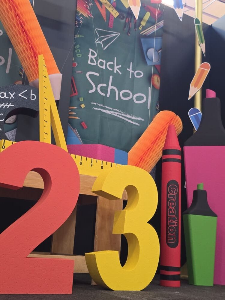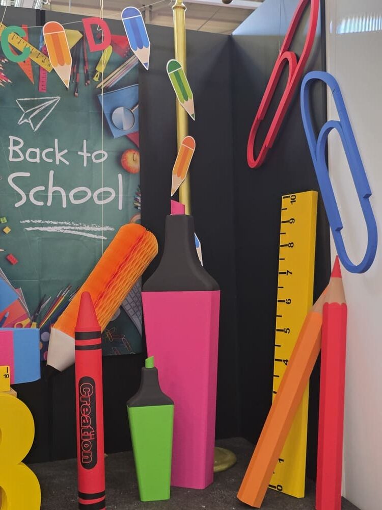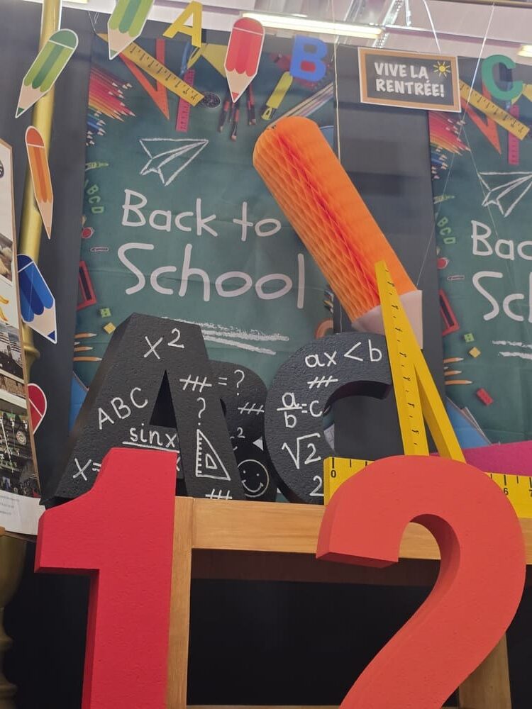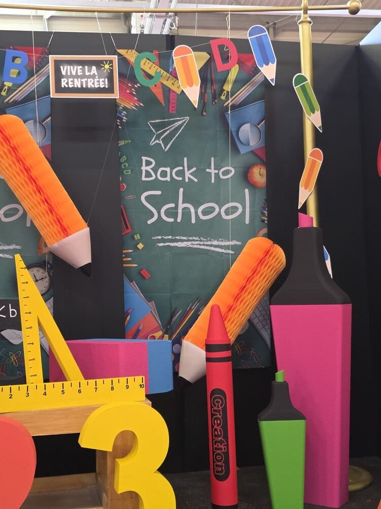Enfin, un espace rentrée scolaire a été installé avec des fournitures scolaires géantes : surligneurs, règles, équerres, crayons gris, crayons de couleurs, gomme, trombones, ainsi que des chiffres et lettres géantes en polystyrène et des kakemono tissu sur le thème de l’école.